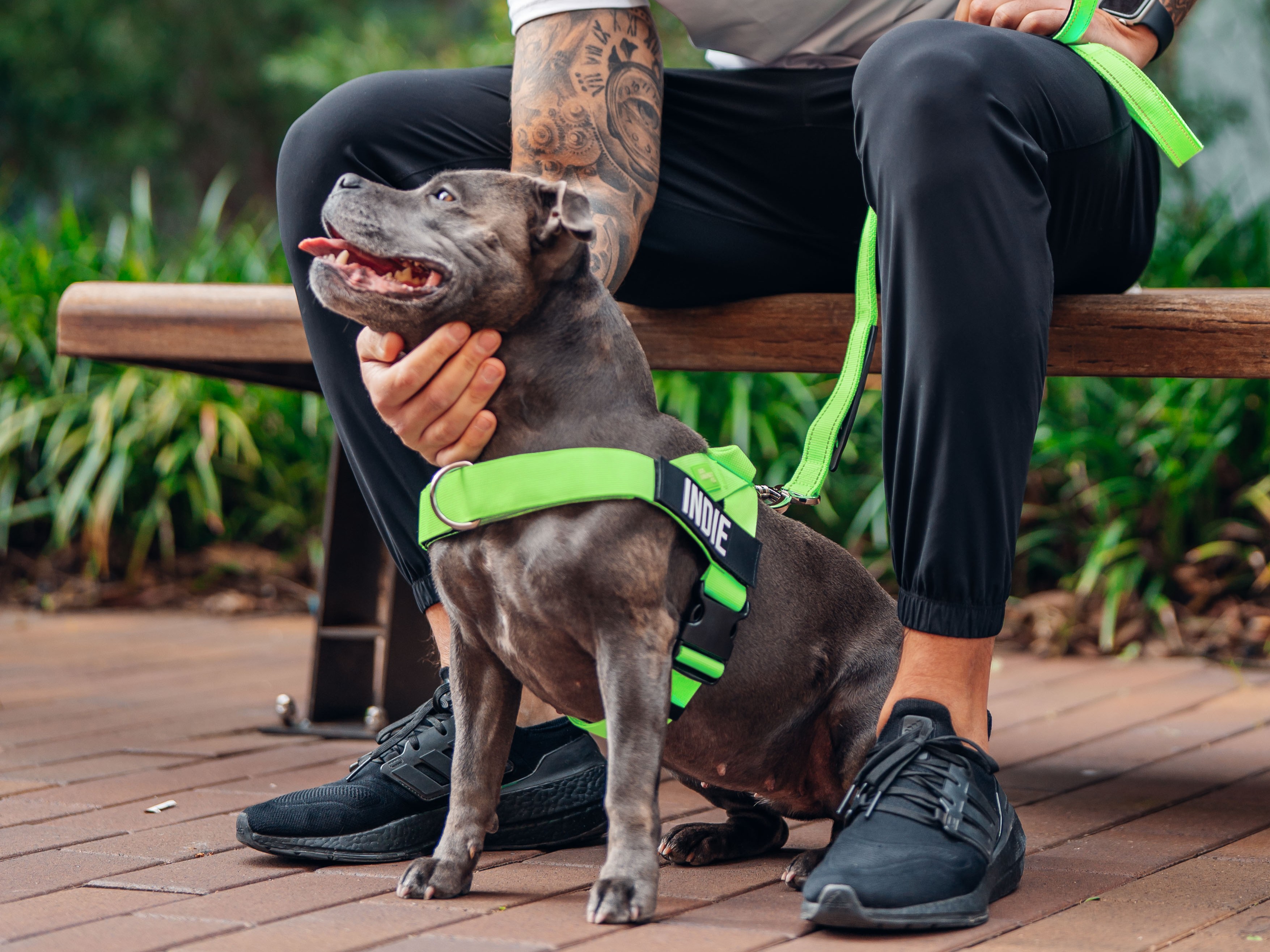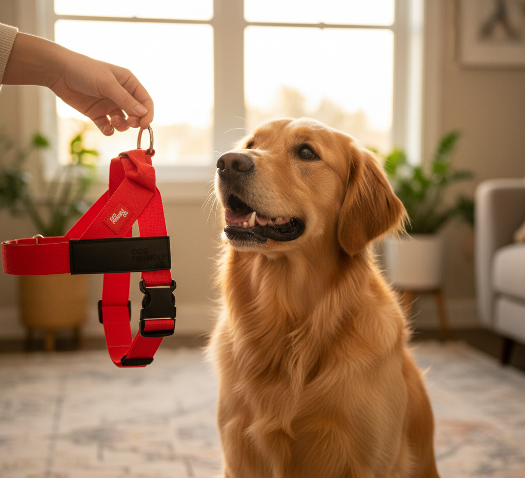 The Dog Friendly Co. harness distributes pressure evenly and moves with the dog's natural gait. It doesn't fight against their body mechanics.